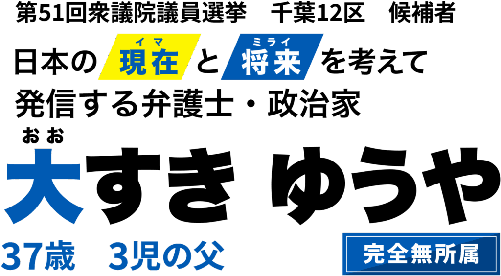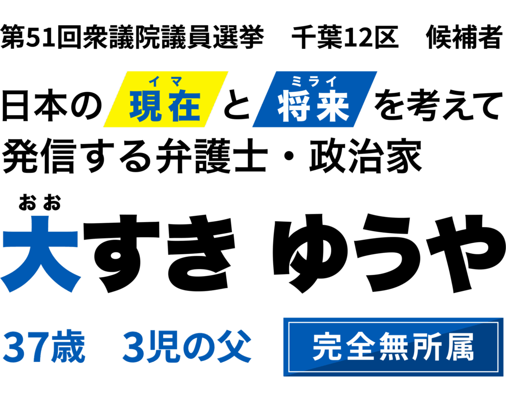 “日本の政治、分かりにくすぎやしませんか?”…政治とは、既存の制度の適切な運用と既存の制度の限界を新たな制度の創設により克服することです。そのため、国会議員、市長・市議の主たる活動は、法律・条例の制定行為にあります。それにもかかわらず、国会や市議会でどのような法律・条例の制定行為が議論されているのか、政治家から国民・市民に対する発信があまりにも少ないように思います。日本で生活する1人の国民・市民として、政治家 大すきゆうや は、国民・市民目線で、日本の政治について発信を続けていきます。
